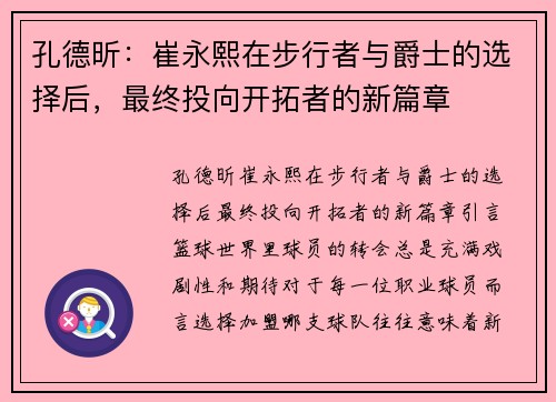 孔德昕:崔永熙在步行者与爵士的选择后,最终投向开拓者的新篇章